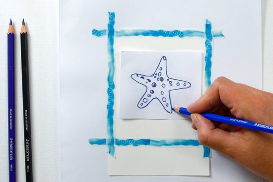1. Töltsük le innen a tengericsillag mintát, és nyomtassuk ki. Árnyékoljuk a sablon hátulját a sötétkék akvarell ceruzával. Helyezzük a sablont (az előlappal felfelé) pontosan az akvarellpapír közepére. Az akvarellceruzával rajzoljuk le a körvonalakat és a vonalakat. Ezzel a motívumot átvisszük a papírra. Mielőtt eltávolítaná a sablont, ellenőrizze, hogy minden vonal átkerült-e.