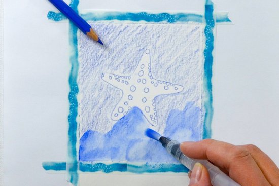 2. Árnyékoljuk sötétkékkel a tengeri csillag körüli területet. Fessük meg a hátteret az akvarell ecsettel. Ha élénk hátteret szeretnénk, cseppentsünk vízcseppeket a kissé nedves színbe.