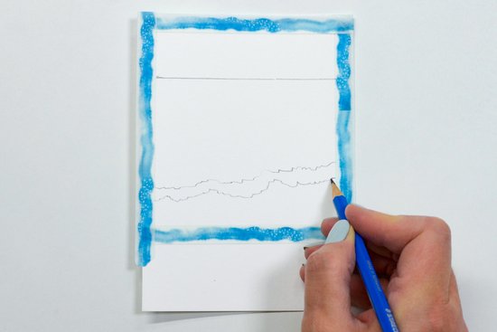 1. Rajzoljuk meg a horizont vonalát a felső harmadban. Az alsó harmadban rajzoljunk egy enyhén átlós kettős vonalat a hullámok fehér csúcsainak. Ez a vonal legyen görbe.