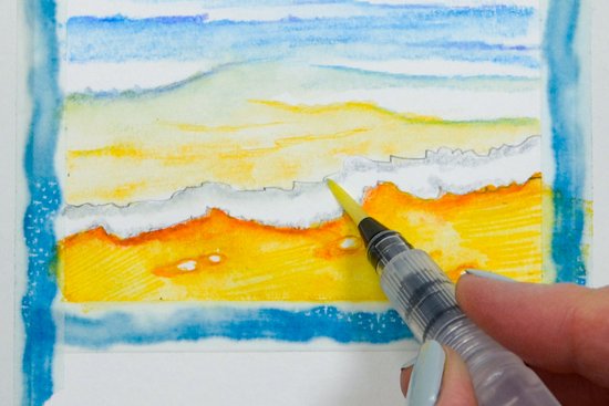 6 .Készítsük el a strandot okkersárga és vörösesbarna színnel. Rajzoljuk körbe a kis köveket, majd fessük meg a strandot, a víztartályos ecsetet enyhén nyomjuk a papírra.