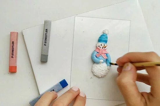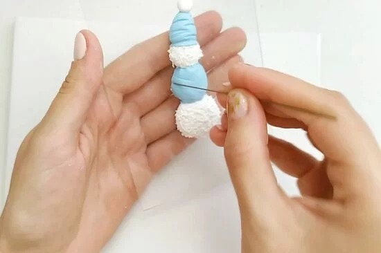 1. Készítsünk három különböző méretű golyót a FIMO fehér gyurmájából. Formáljunk egy hóembert belőle, majd tű segítségével alakítsuk a gyurmát úgy, hogy olyannak tűnjön, mintha hóbol készítettük volna.