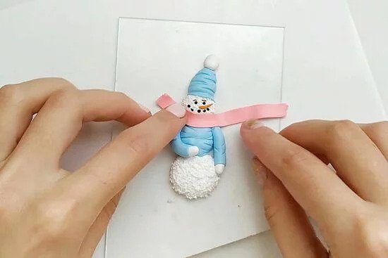 3. A hóember sapkáját is fedjük le FIMO pasztellvíz színű gyurmával és vágjuk le a felesleget. A tű hegyével pedig készítsük el a pulóver és a sapka mintázatát.