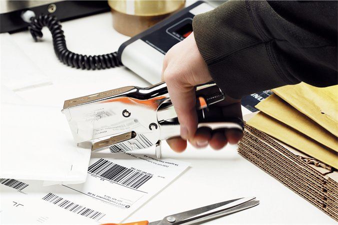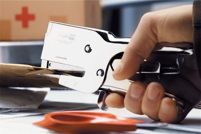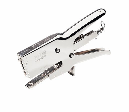 - nagyteljesítményű kézi tűzőgép, nikkelezett kivitelben és ujjvédővel, ideális a bélelt borítékokhoz, kis dobozokhoz, stb.